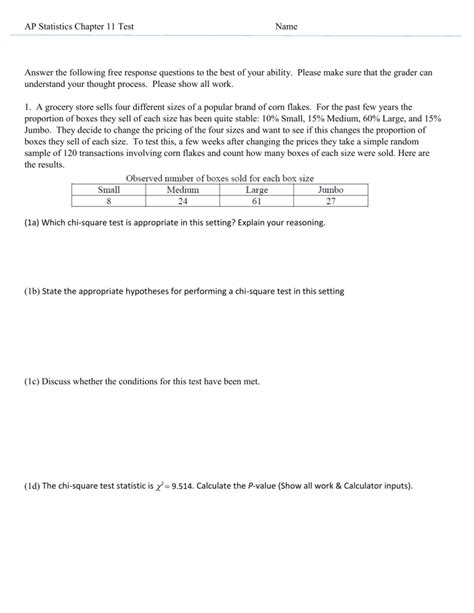 Ap Statistics Chapter 11 Test. Free response show all your work. The test is based on a statistic that compares the value of the parameter as stated in the null hypothesis with an estimate of the parameter from the sample data.