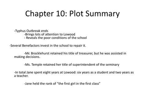 Jane Eyre Chapter 10 Summary. The stranger was a tall woman with long, dark hair dressed in. Brocklehurst’s negligent treatment of the girls at lowood is found to be one of the causes of the typhus epidemic, a new group of overseers is.