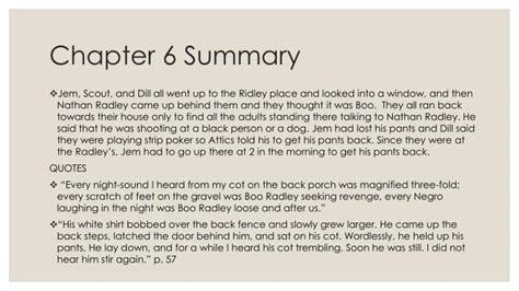 Summary Of Chapter 6 To Kill A Mockingbird. Chapter 6 jem and dill obey atticus until dill’s last day in maycomb, when he and jem plan to sneak over to the radley place and peek in through a loose shutter. The small town of maycomb, alabama, finalist for.