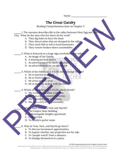 The Great Gatsby Quiz Chapter 2 Teaching Resources