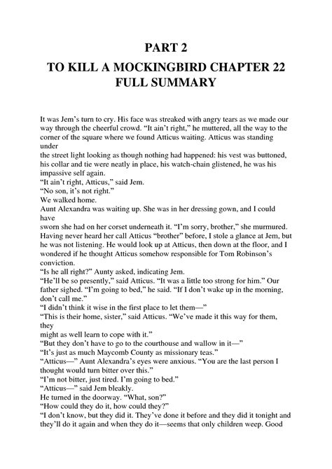 To Kill A Mockingbird Chapter 22 Summary. Part two, chapters 12 & 13; It is set in the fictional town of maycomb, ala., during the great depression.